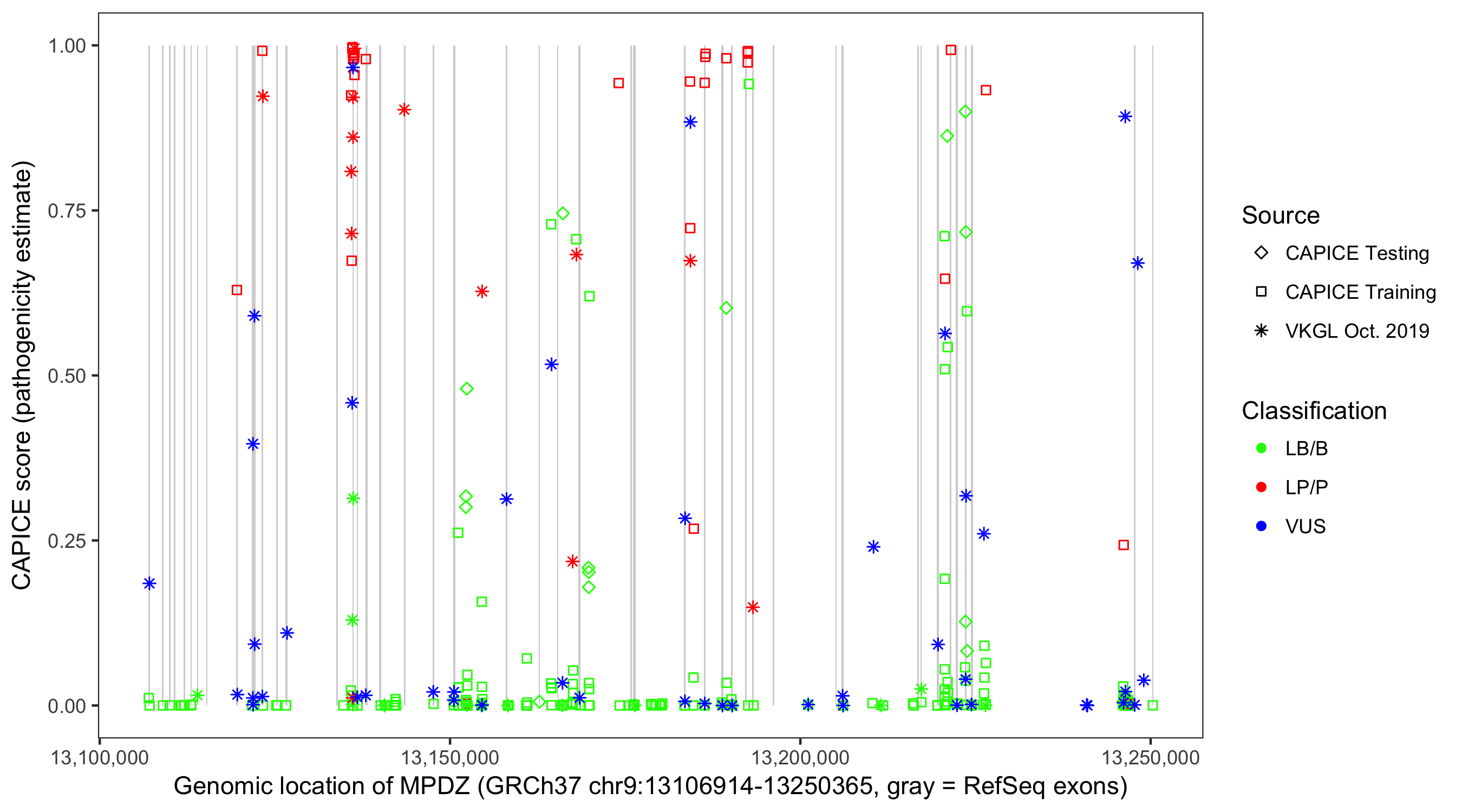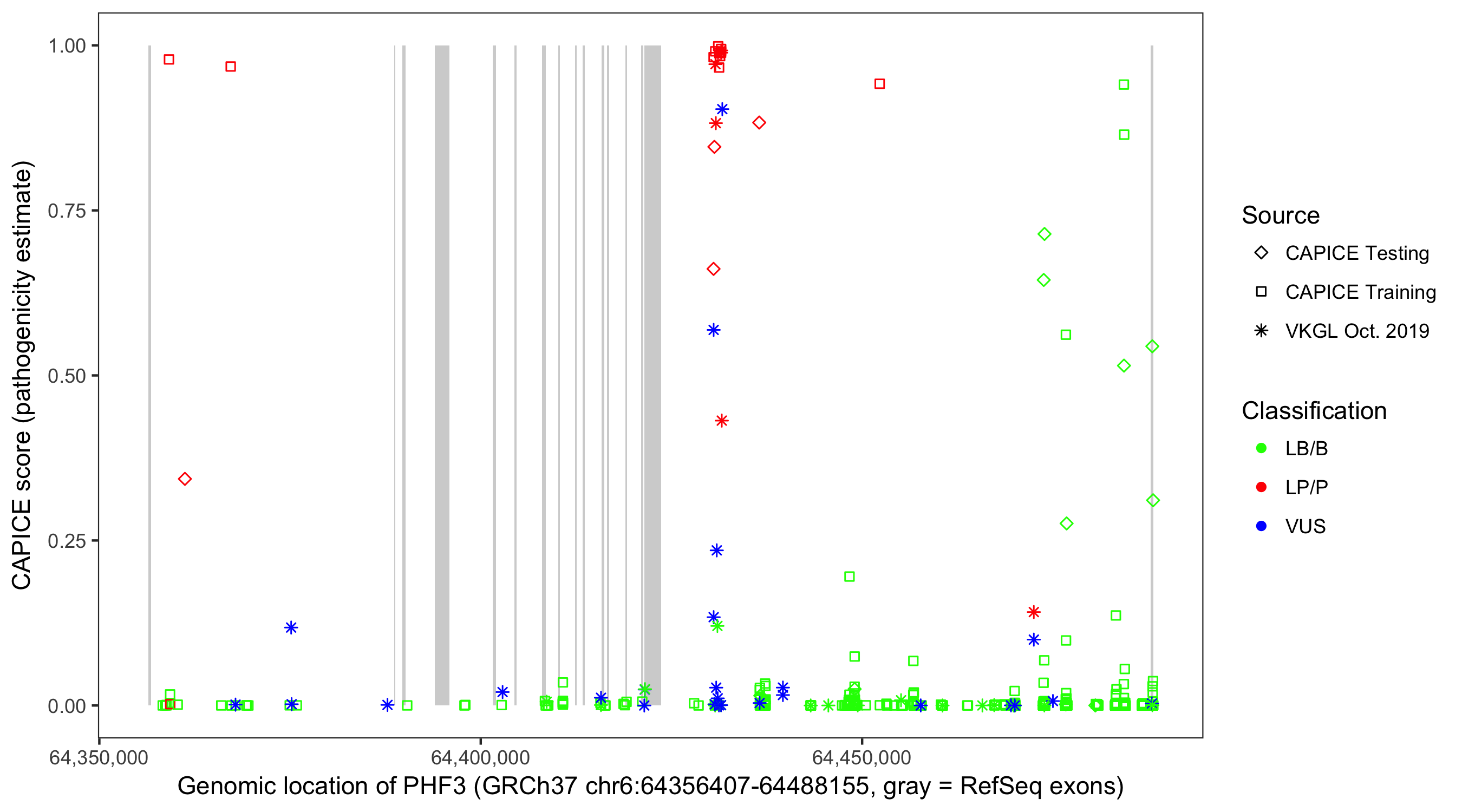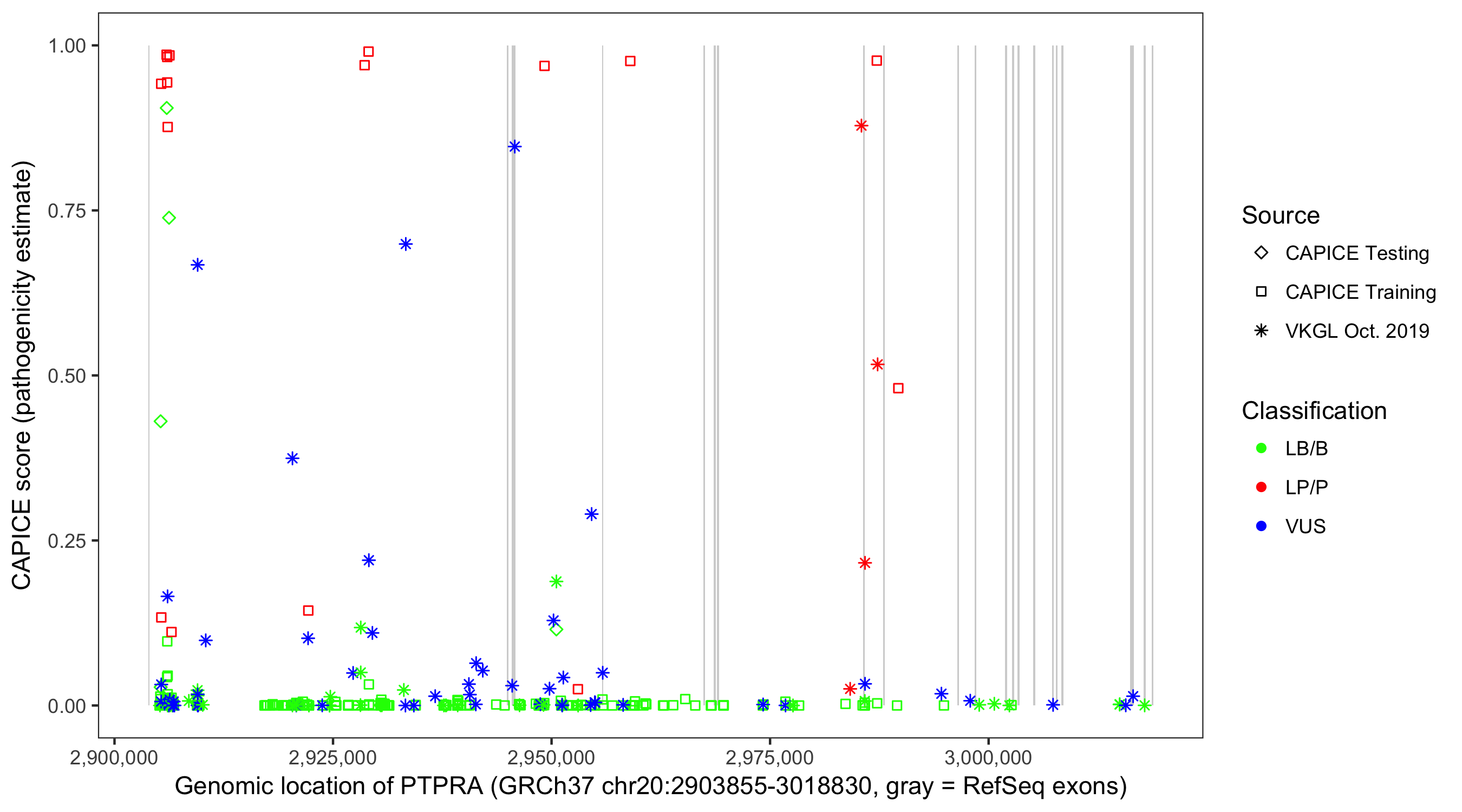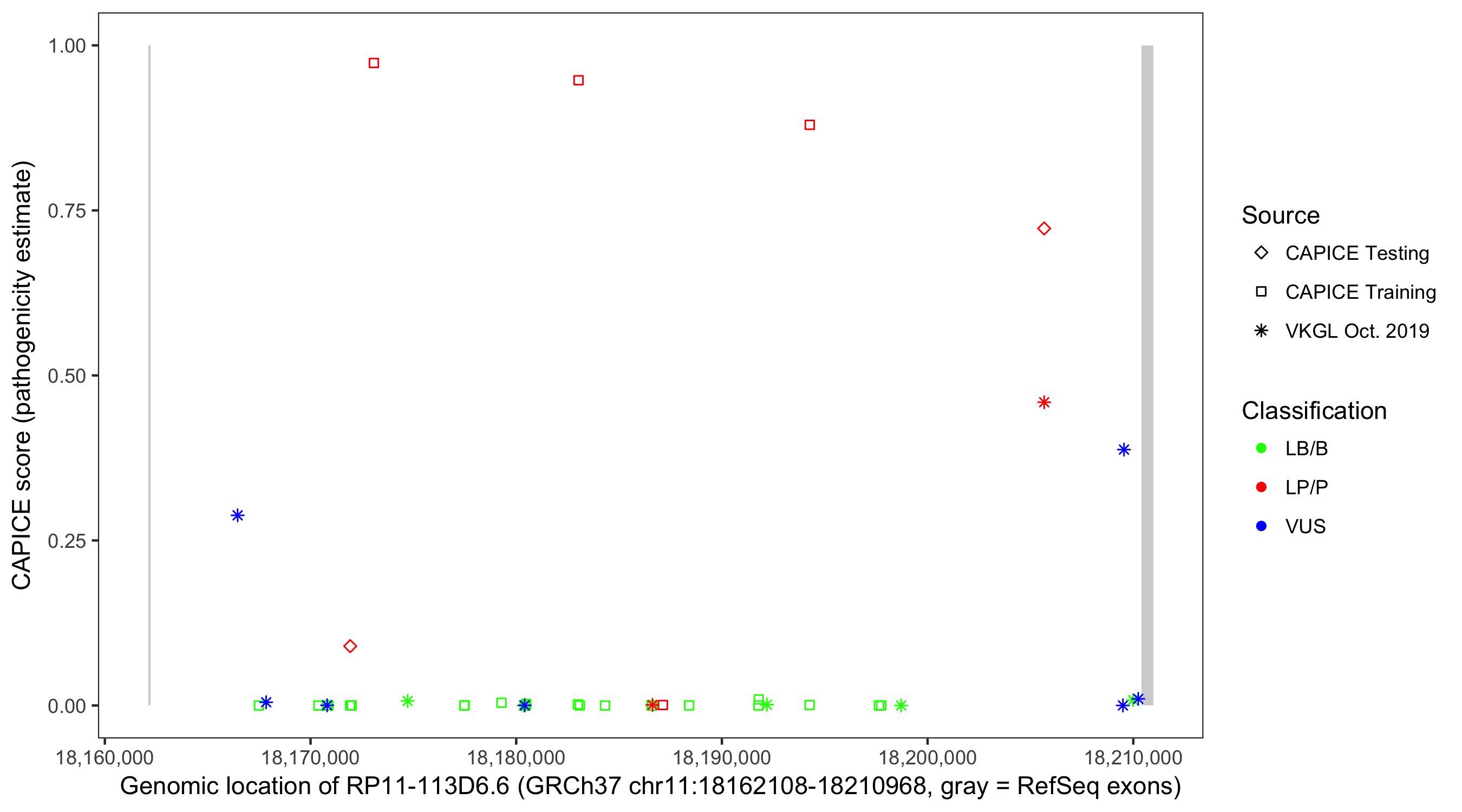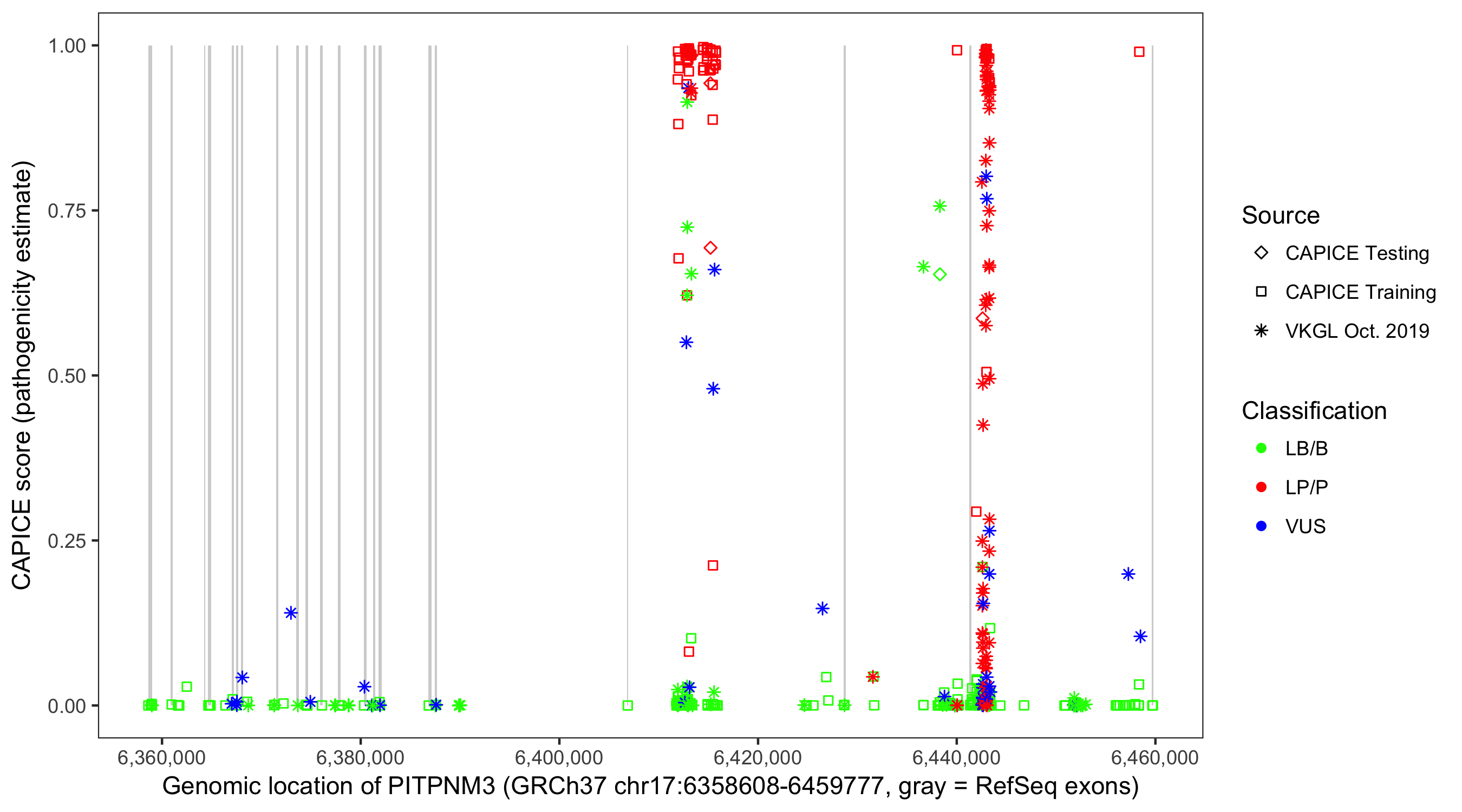 Shown are CAPICE train/test variants plus VKGL Oct 2019.